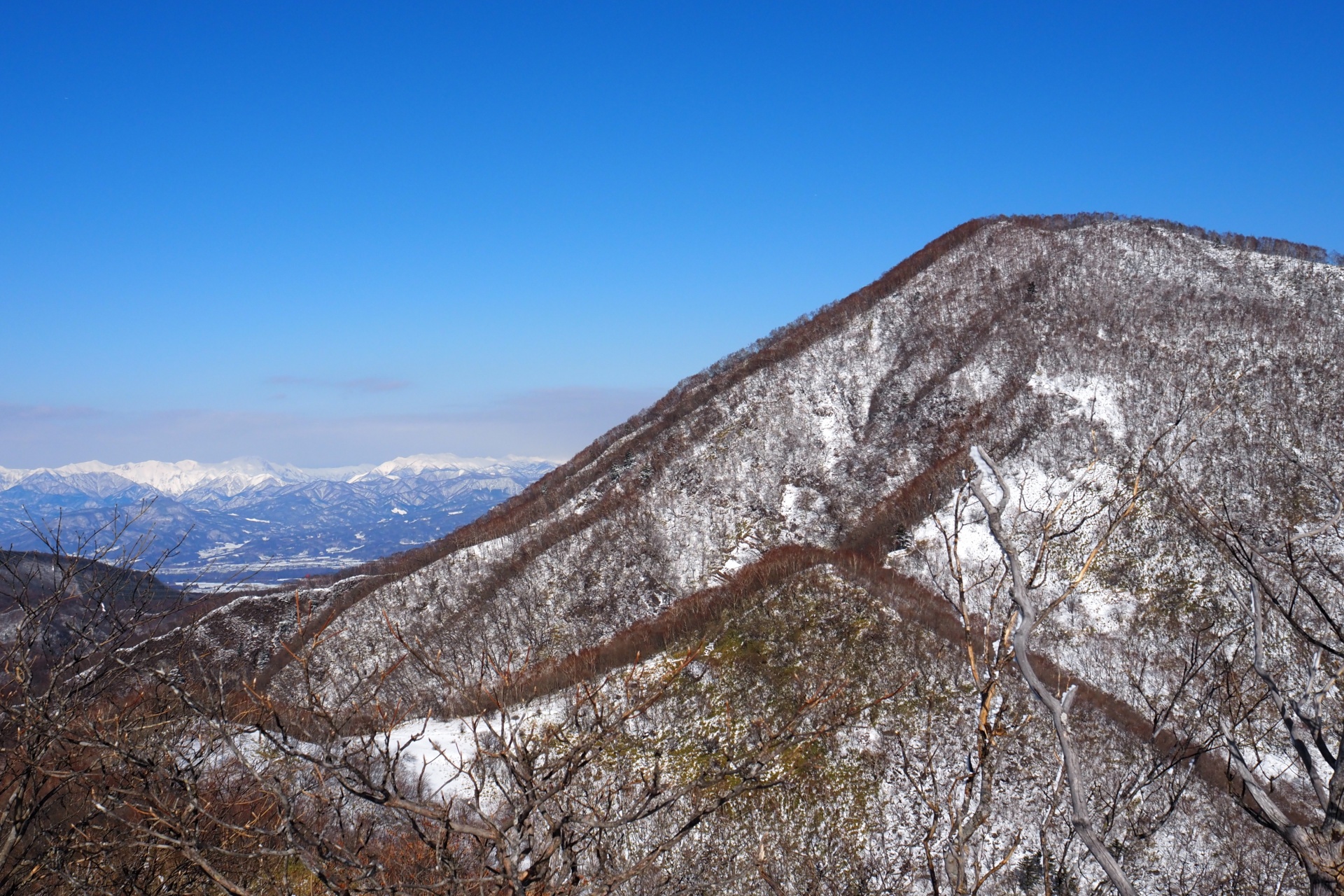 駒ケ岳山頂は風が吹き抜けるので平年でも雪が少ないが、今回は土が露出していた。山頂からの展望はなかなか良いのだけど、東京方面は霞んでいて見えなかったのが残念だ。