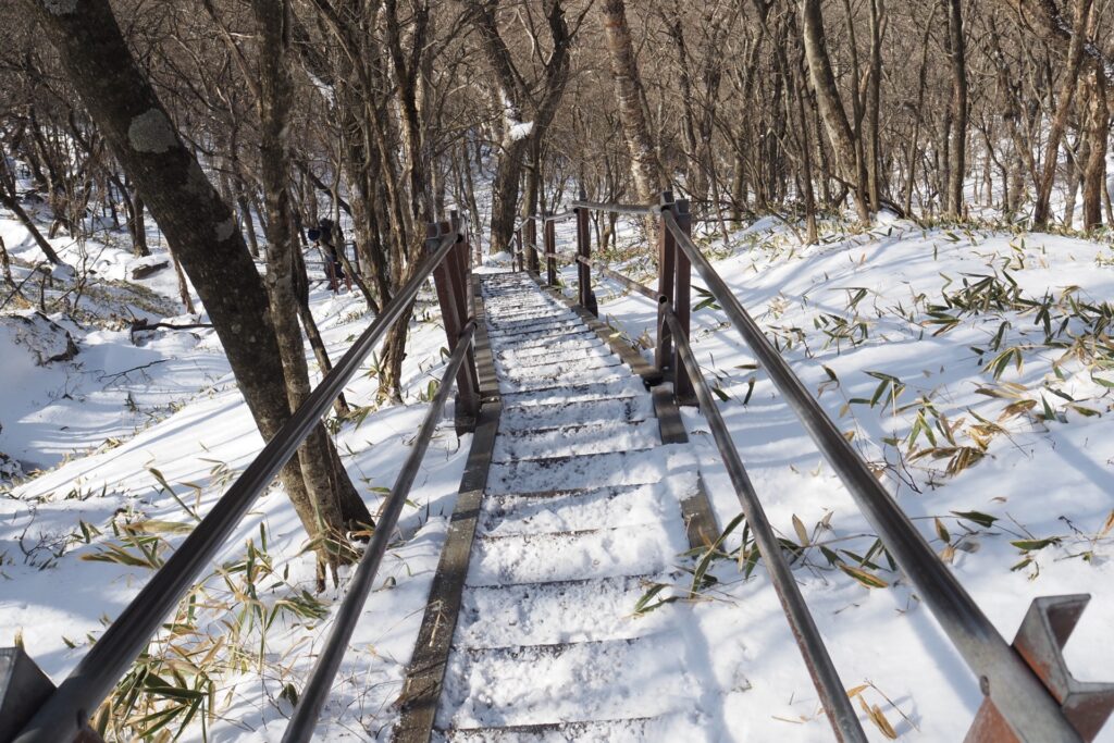 少し休憩をしたら大沼まで下る。鉄階段は雪が多いと通れないこともあるが、今回は普通に通過できた。ここは滑りやすいので要注意だと思う。