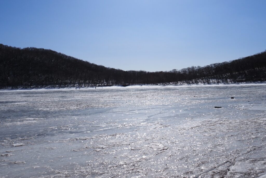 チェーンスパイクを付けて湖面を歩いていると、ガゴンっと言う大きな音がした。何だかキュンキュンと言う音がしているし、怖いので途中で引き返す。厳冬期なら大丈夫だと思うけど、歩く人は自己責任で歩こう。
