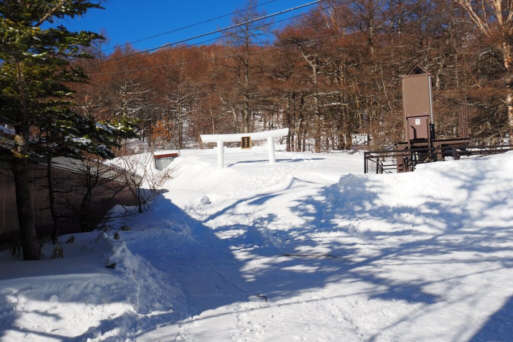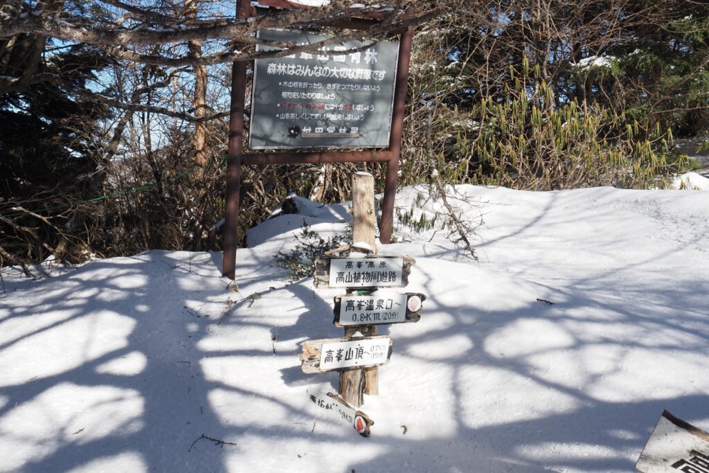 山頂の神社で山行の無事をお願いしてから、来た道を戻って高峰温泉へと向かう。スキー場の横を通るし、スノーシューツアーコースなので、迷うことは無いはずだ。