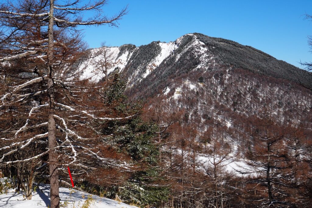 さらに進んで行くと、岩場を迂回するような冬ルートになる。樹林帯の中につくられたルートで、危険は無いものの地味に疲れた。