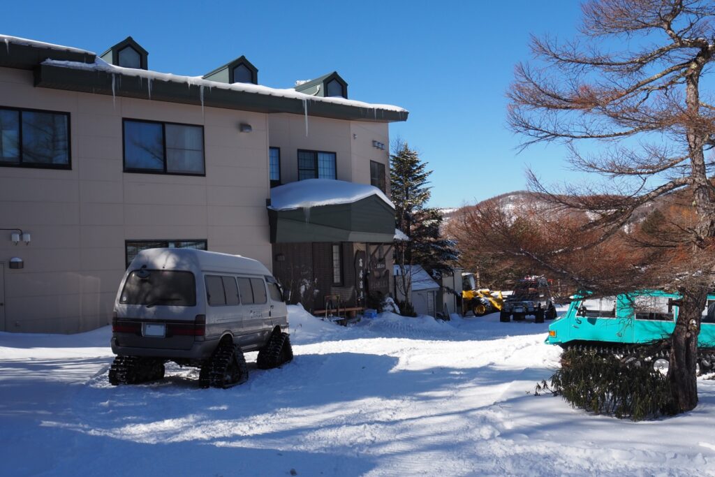 駐車場:高峰高原ビジターセンター駐車場(30台台程度:無料)を利用。満車の場合には、高峰マウンテンパークスキー場(旧アサマ2000パーク)の駐車場が利用できるようです。なお、チェリーパークラインの途中に雪が無くても、高峰高原ホテル付近から駐車場の間は常に凍っているため、冬季はスタッドレスタイヤが必須となります。