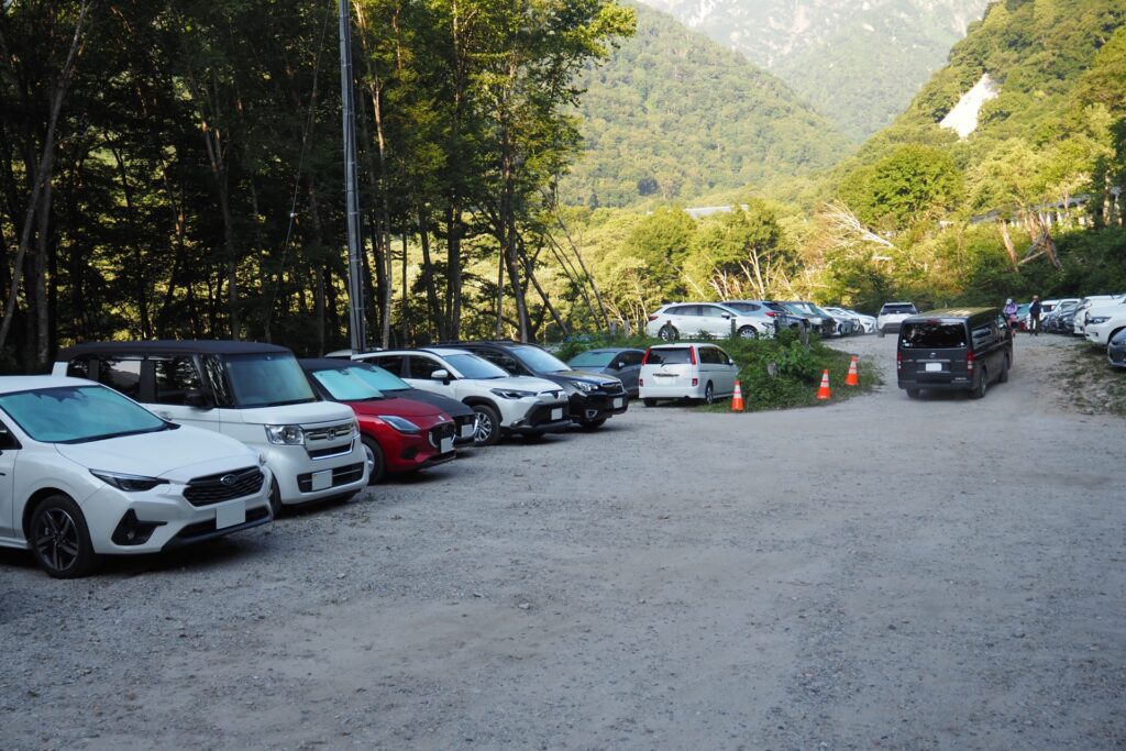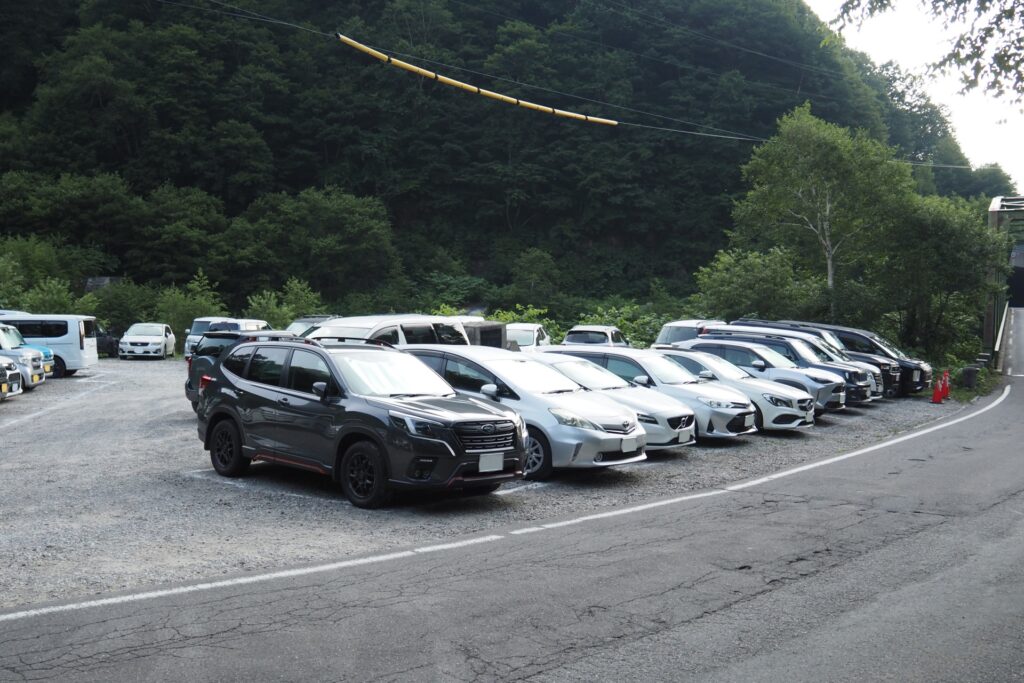 駐車場を探して彷徨っていると、歩いていた人が扇沢無料市営駐車場第二の奥に一台分だけ空いていたと教えてくれたので、無事に駐車することが出来た。平日なら余裕で駐車出来ると思っていたのだけど、認識が甘かったようだ。