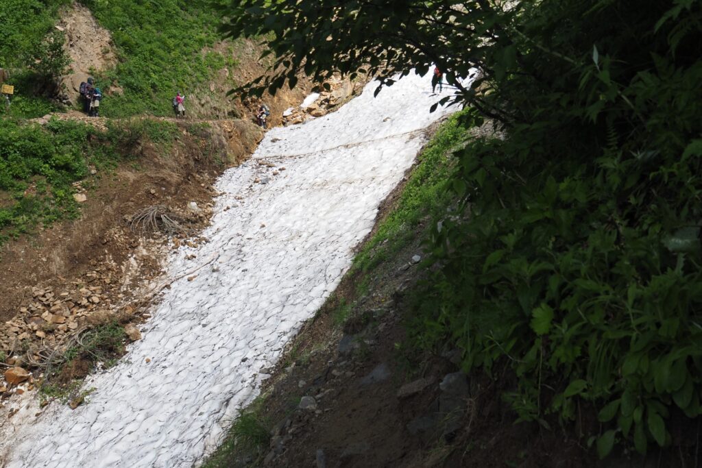 そんな道をテクテクと歩いて行くと、やがて種池山荘が見えてきた。この付近には、唯一の危険個所と言える、ガラ場の雪渓がある。