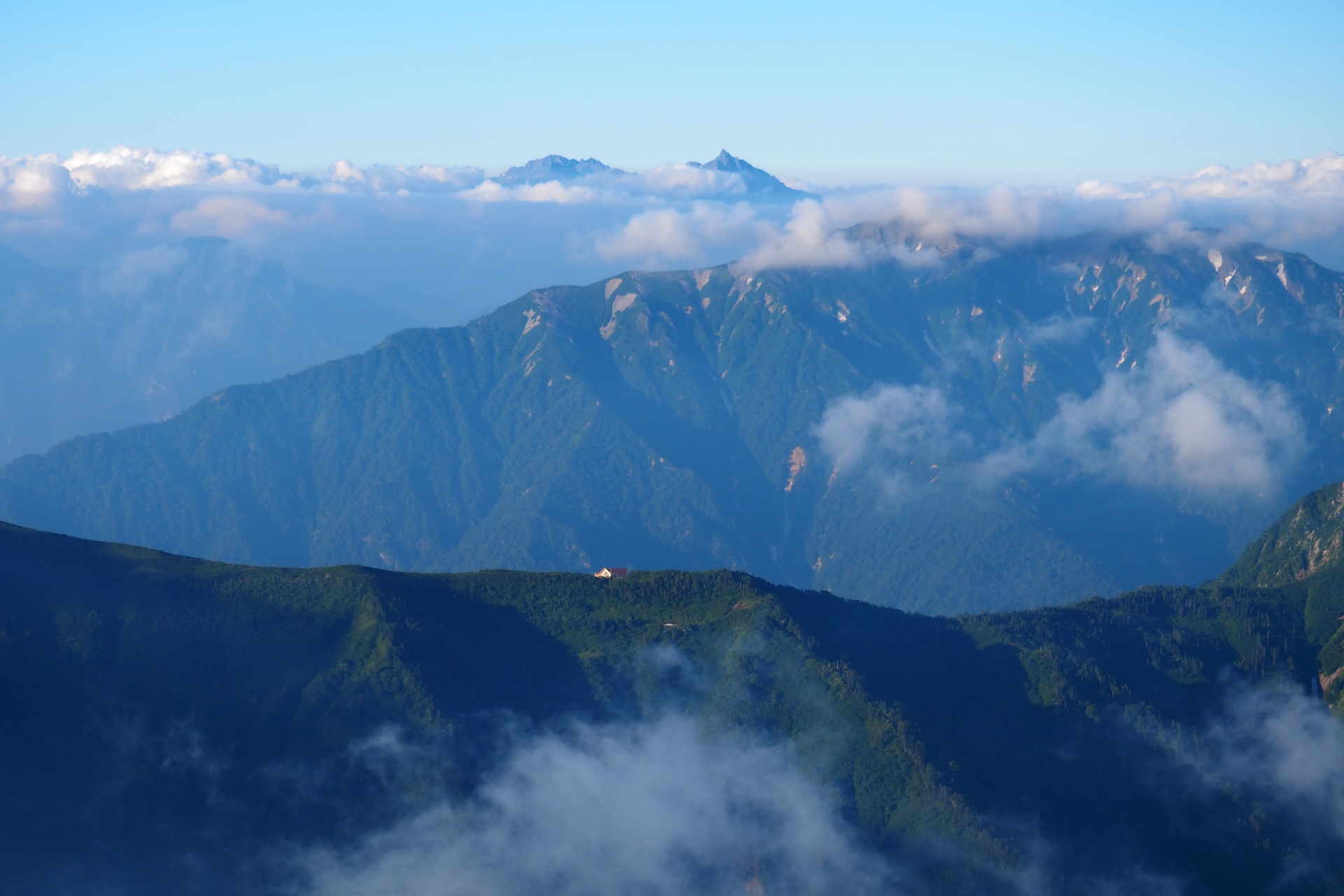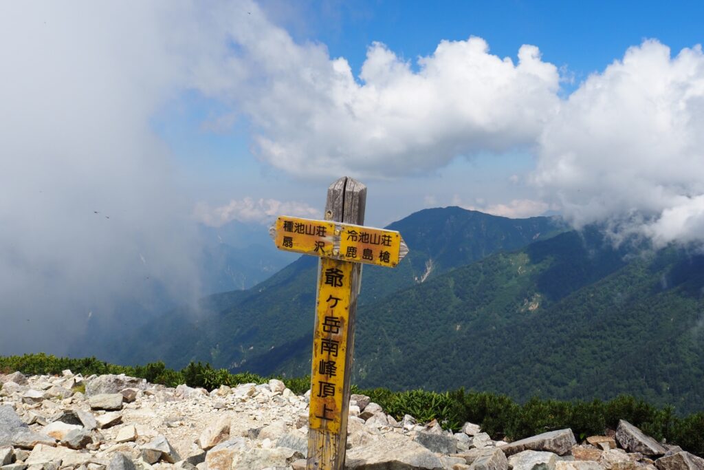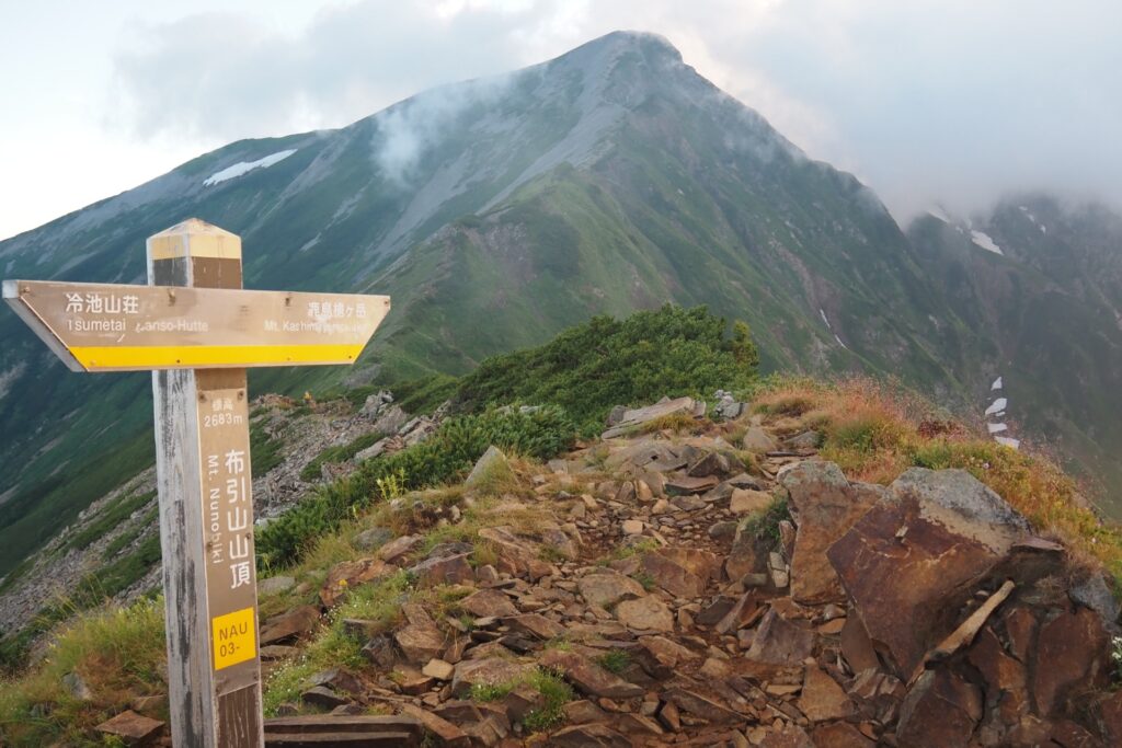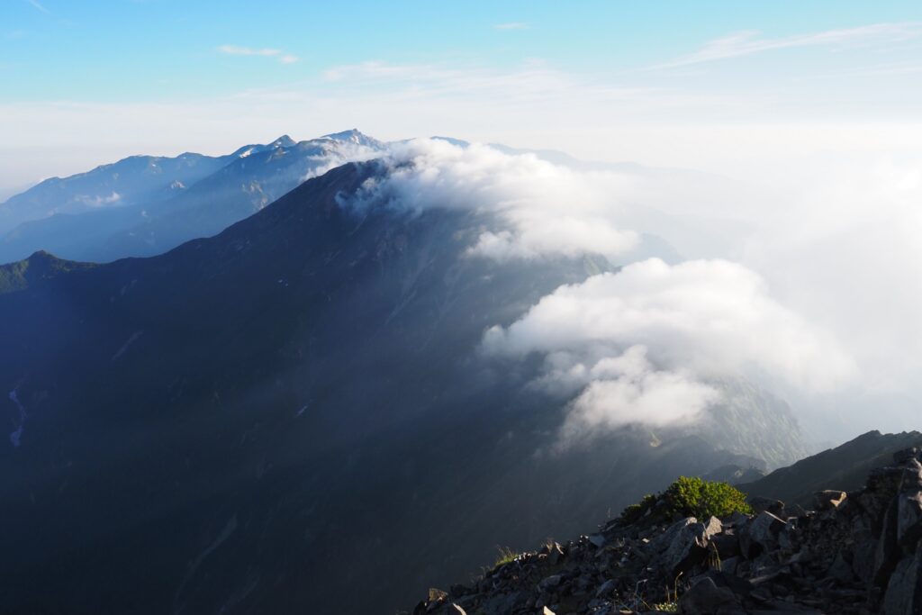 白馬岳・五竜岳方面はガスが掛かっていたものの、それも良い感じ。鹿島槍ヶ岳は双耳峰のため、すぐ近くに北峰があるけど、そちらは終始見えなかった。