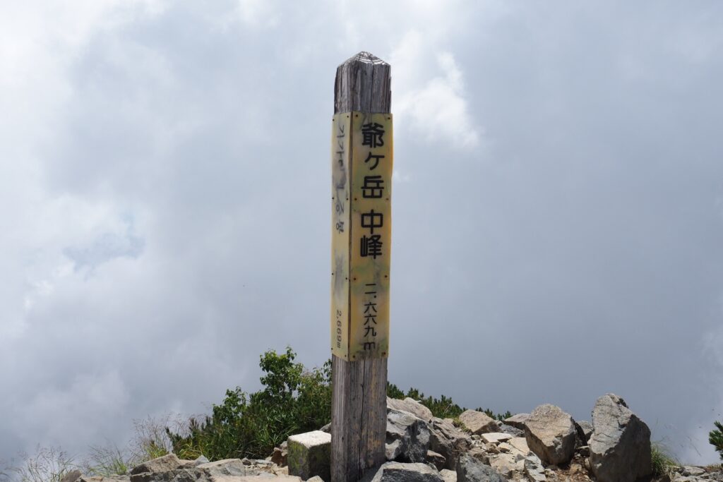 爺ヶ岳中央峰はルートから少し外れるからか、スルーする人が多いようだ。折角なので頑張って登って山頂へ。ガスが上がって来ていたため、展望はイマイチだったが、立山連峰方面はそれなりに見えていた。