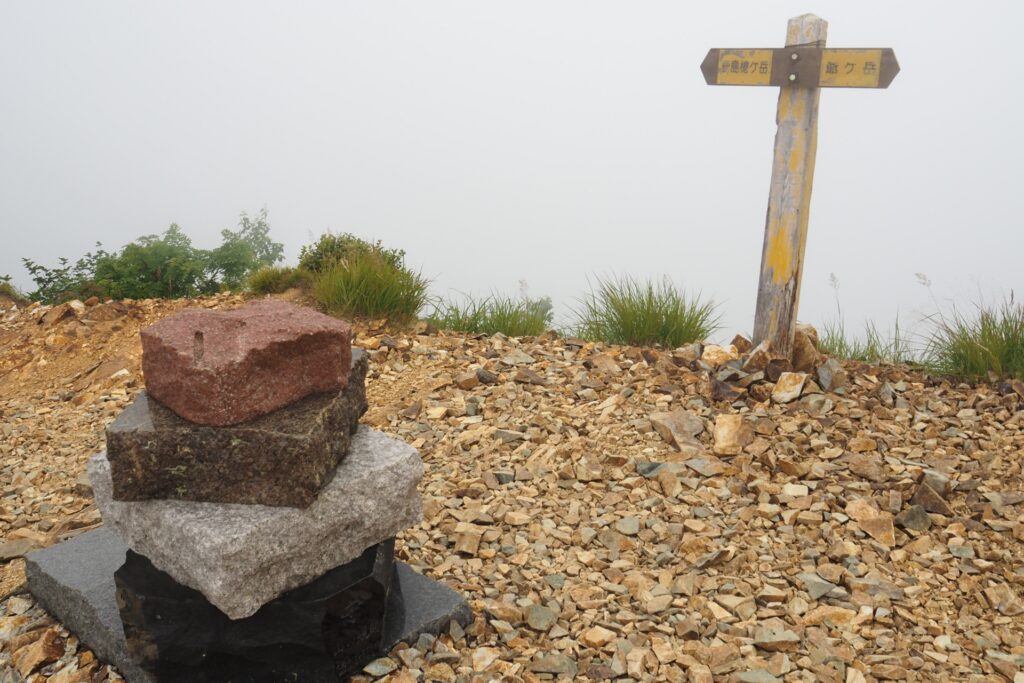 爺ヶ岳南峰の山頂には、標識と三角点がある。一番標高が高いのは中央峰であるが、南峰しか登らない人が多いみたいだ。