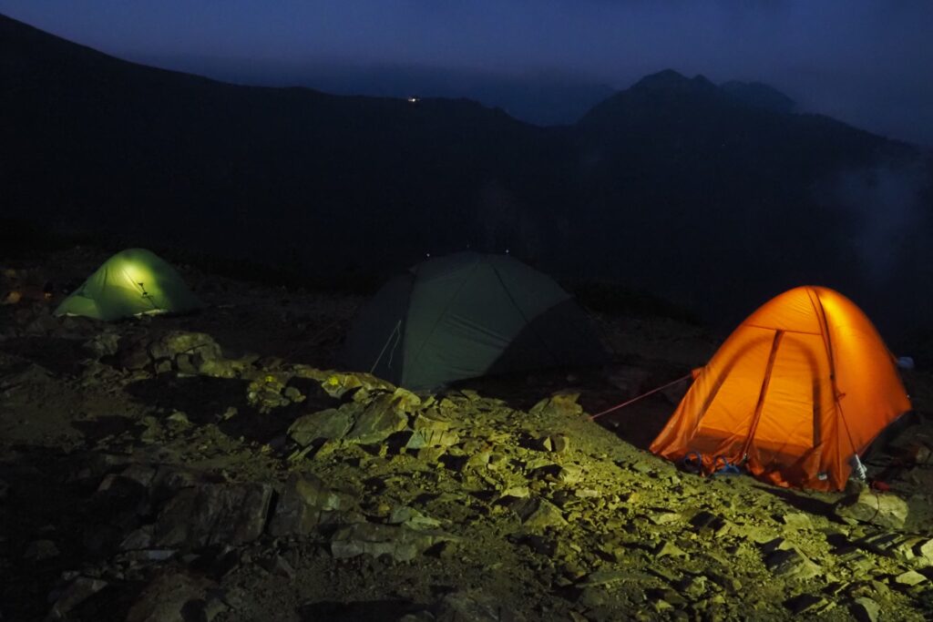 午前2時半頃からテントを撤収している方が何人かいたため、私も起きて散策の準備をした。テント泊だと爆睡するのが普通なんだけど、寝心地が悪かったのか、あまり寝た気がしない。