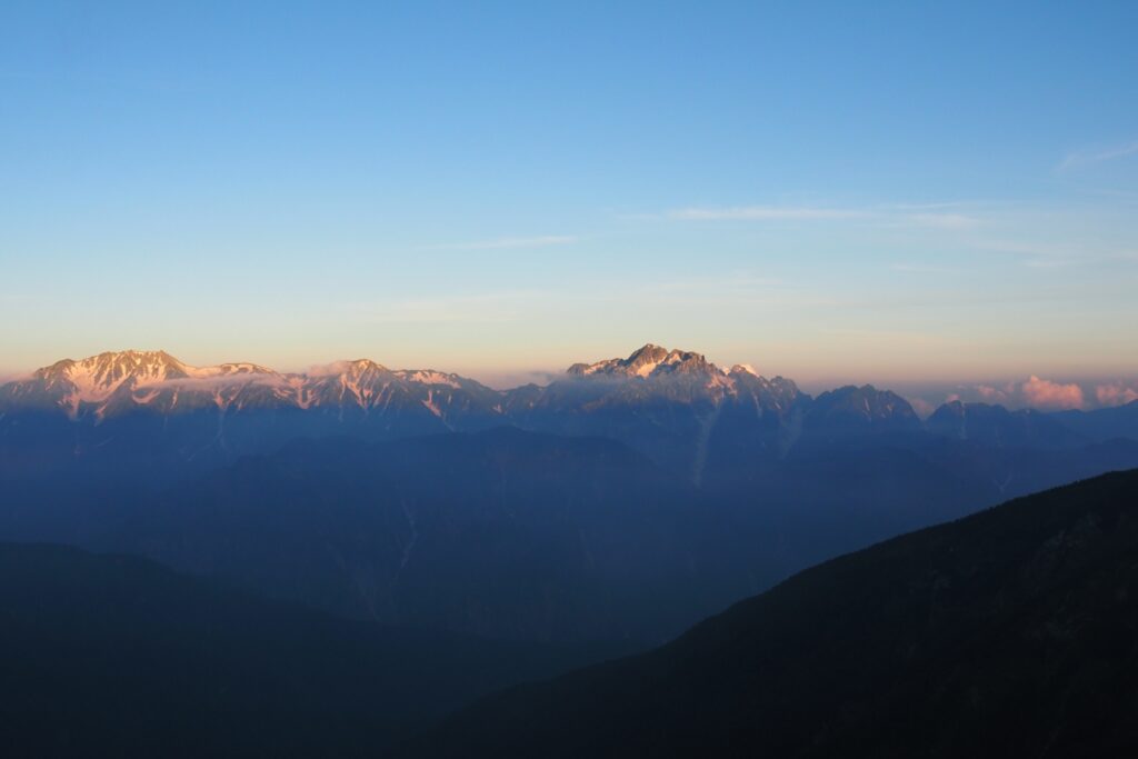 テント場から1時間ほどで布引山の山頂に到着。展望はなかなか良く、日の出前にココに到着しておけば良い写真が撮れるかもしれない。