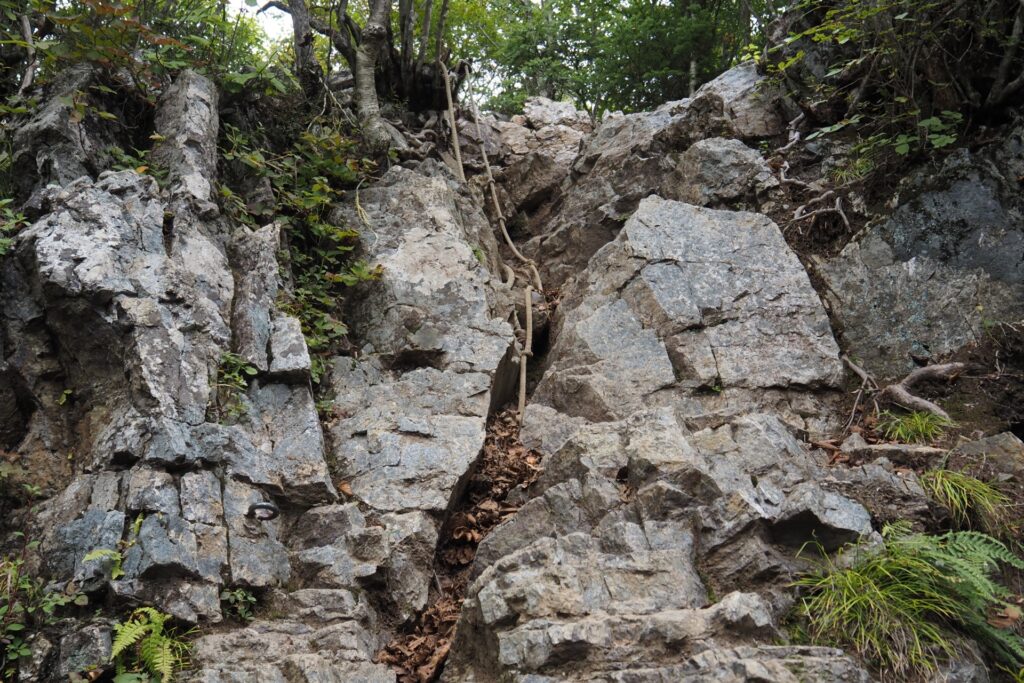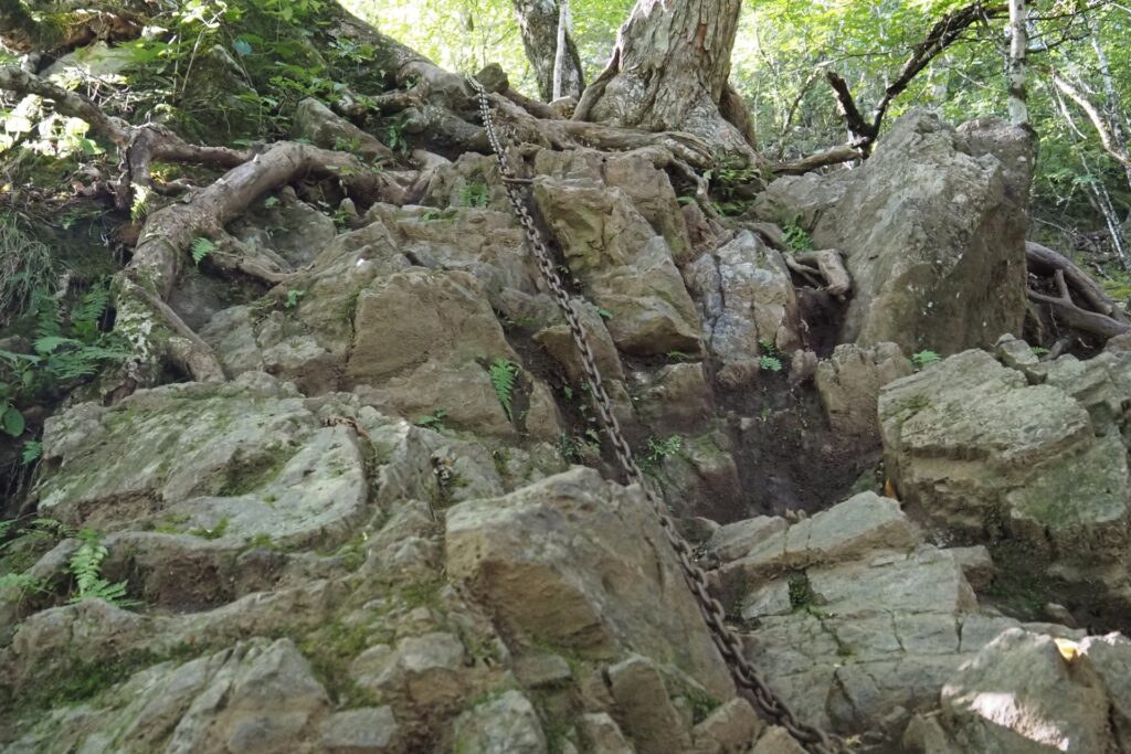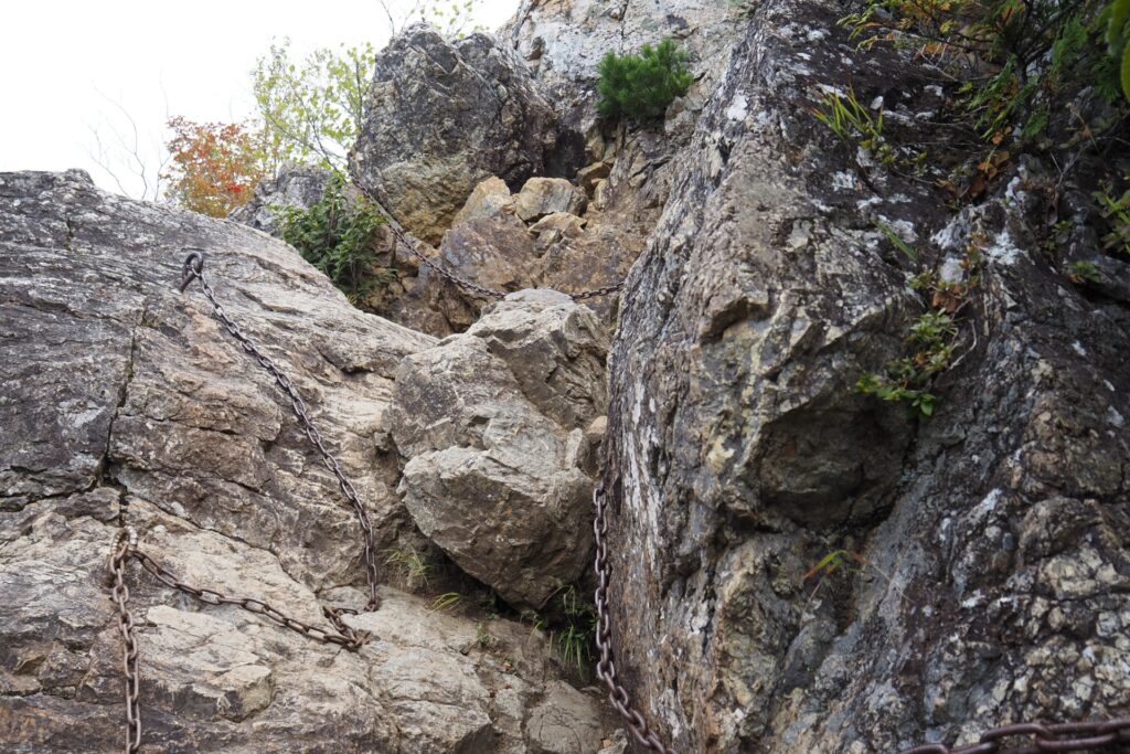 神社を過ぎて少し行くと岩場が出てくる。ここまでの鎖場と同じく、いずれも難易度は低いので心配することはないだろう。ゆっくりと登り降りすれば問題無いはずだ。
