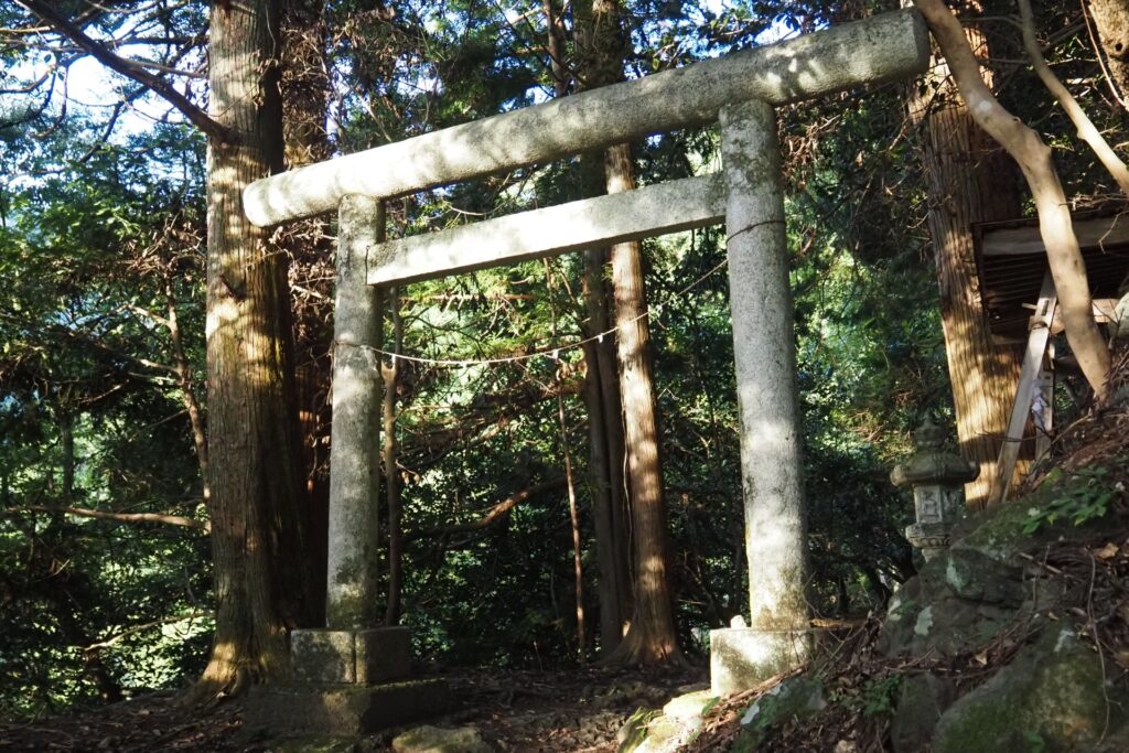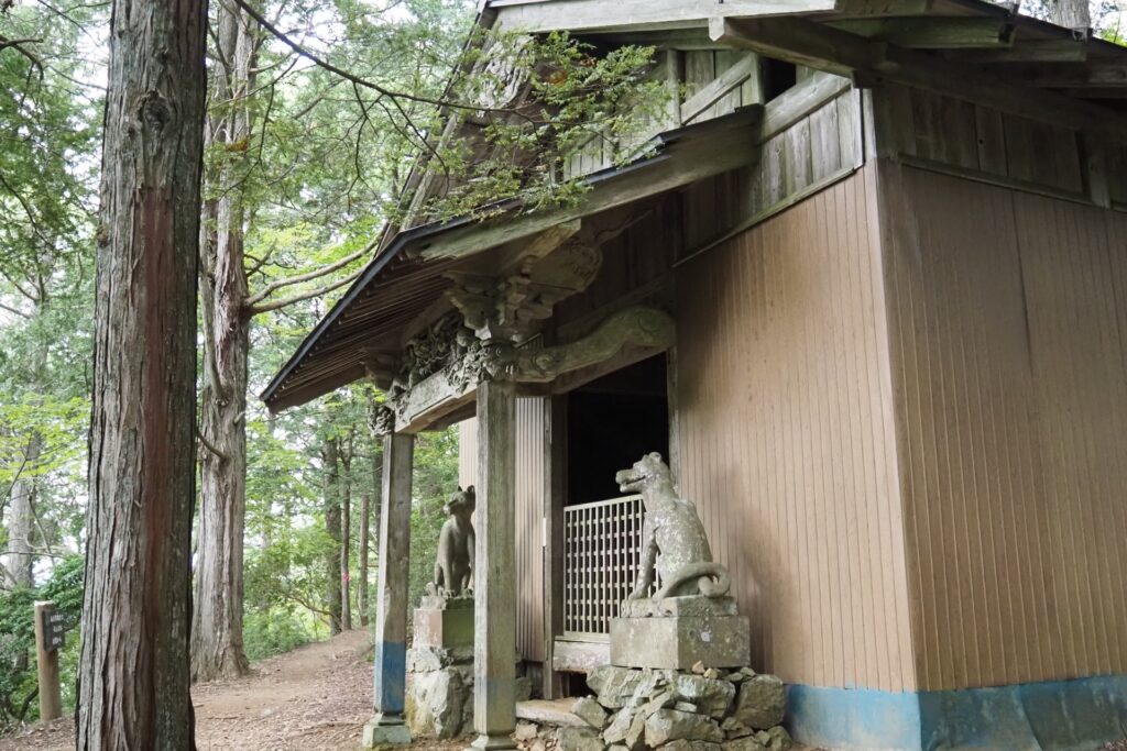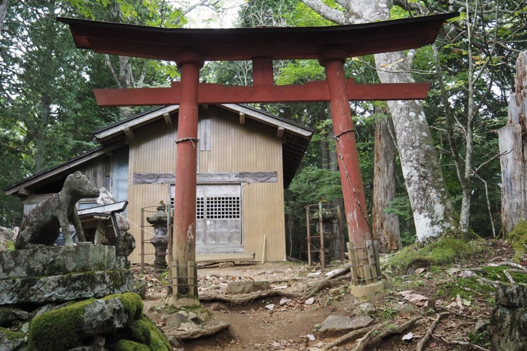 山頂の祠に、無事に帰れますように……とお願いしてから下山を開始。体調不良と蒸し暑さでグロッキー状態になりながらも、ストックに頼りつつ、休みながら何とか登山口まで戻った。