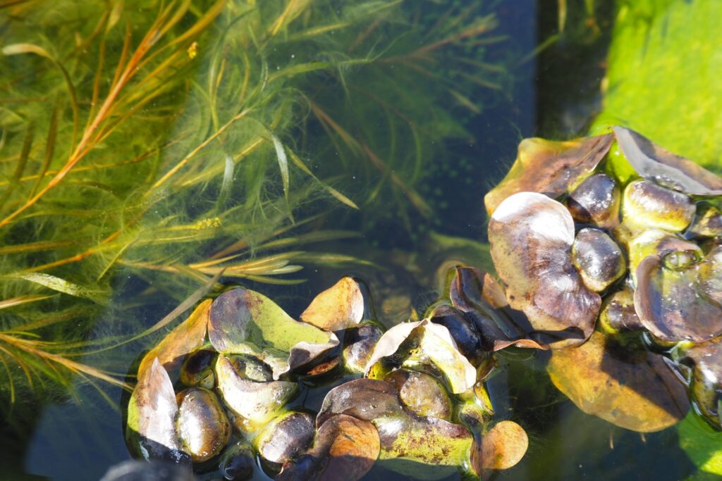 ビオトープによく使われるホテイソウは、霜が当たらないようにビニールなどで保護しておけば駄目にならないですね。写真のホテイソウは腐っているように見えるかもしれませんが、暖かくなると復活します。